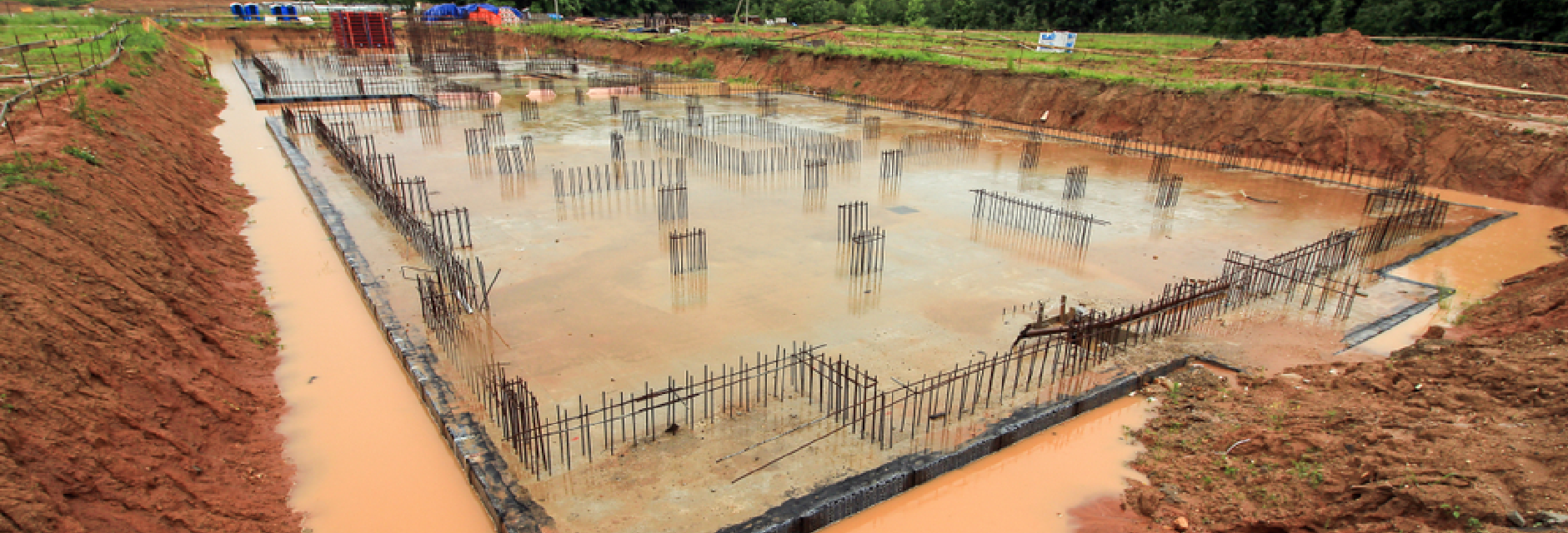 Construction site with multiple steel rebar columns set in concrete bases, showing preparation for building work and supported by water for piling sites.